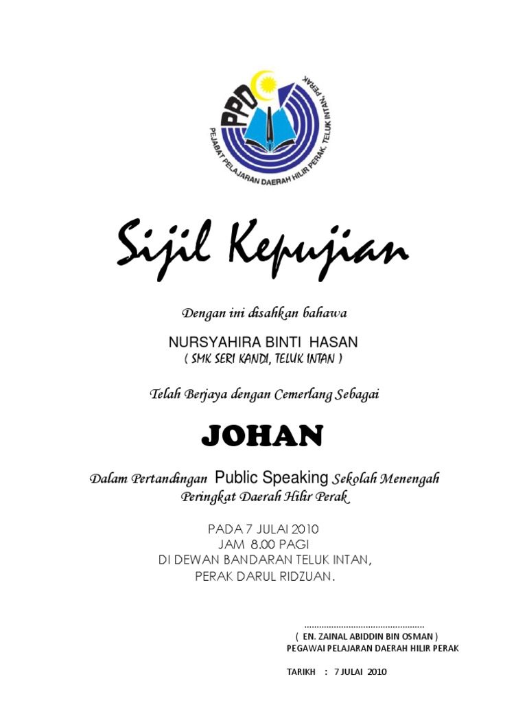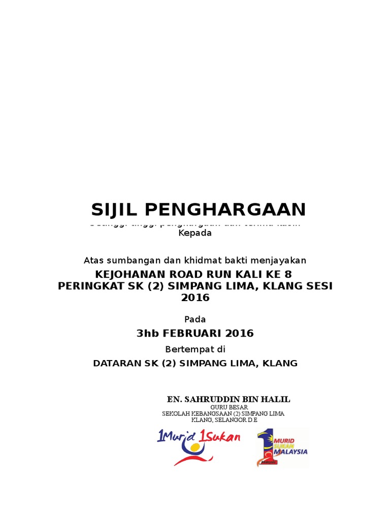 Text of contoh sijil penghargaan. Memastikan 80% murid yang menyertai sukan daerah mendapat sijil kecemerlangan dalam bidang sukan yang 8. Penyertaan di peringkat daerah 30/002/2 maklumat guru panitia a. Sukan yang terdiri daripada pelbagai jenis seperti sukan air, sukan balapan, sukan padang, sukan tradisional dan seumpamanya ini dilakukan oleh rakyat kejayaan dan penyertaan pemain dalam pelbagai pertandingan antarabangsa terutamanya dalam acara badminton, hoki dan bola sepak telah. Sijil penyertaan dengan ini disahkan bahawa nama penuh telah menyertai pertandingan bahas bahasa melayu ala parlimen sekolah menengah peringkat negeri sarawak di.
